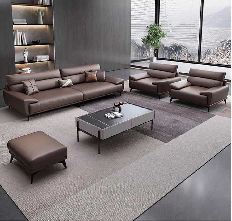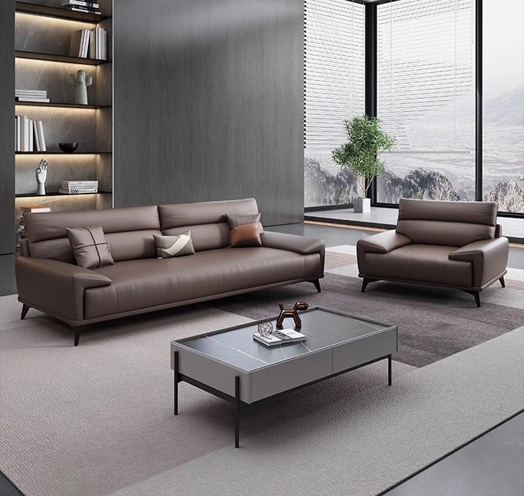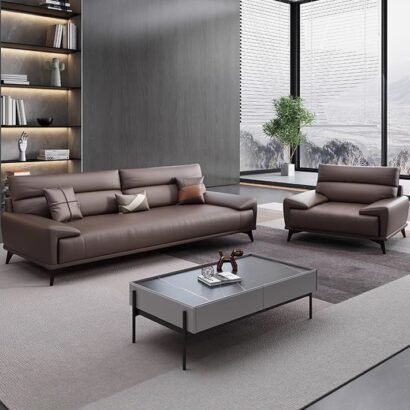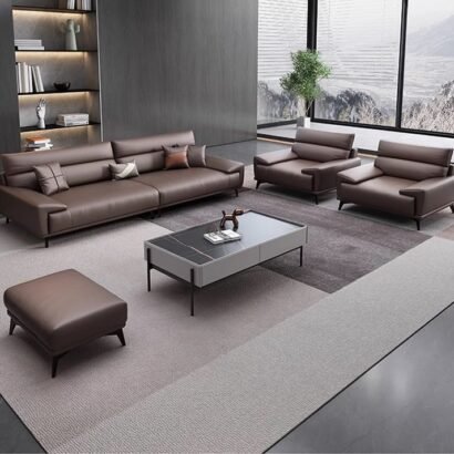 يأتي هذا الطقم المكتبي بتصميم أنيق يعكس الفخامة الهادئة والبساطة العصرية في تكوين متناسق يناسب مكاتب الاستقبال والمساحات التنفيذية الراقية. تتوزع الكنبة الرئيسية مع المقاعد الجانبية والبوف بشكل يمنح المكان مرونة في الاستخدام وجلسات مريحة تساعد على استقبال الضيوف والعملاء بصورة احترافية. كما تضيف الألوان الهادئة والخطوط النظيفة إحساسًا بالرقي والاتزان، بينما تعزز الطاولة الوسطية والتفاصيل المحيطة من جمال الترتيب العام وتمنح المساحة مظهرًا أكثر تنظيمًا وانفتاحًا. ويعد هذا الطقم اختيارًا مناسبًا لمن يبحث عن أثاث مكتبي يجمع بين الراحة، والعملية، والانطباع المهني الراقي