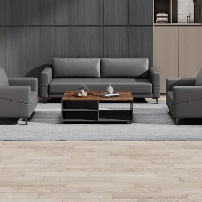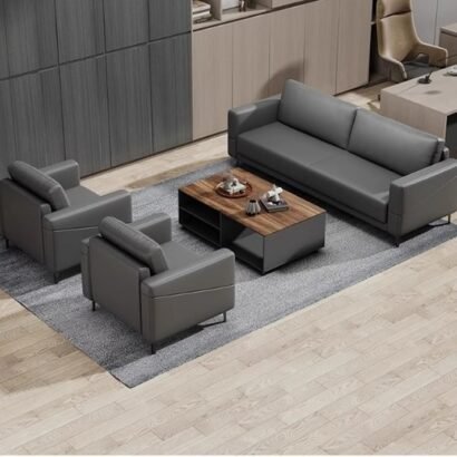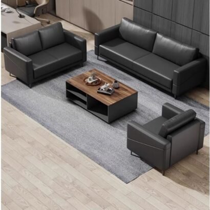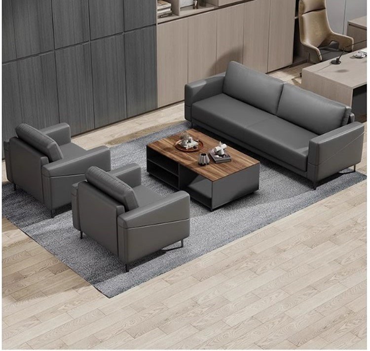 يعتمد هذا الطقم المكتبي على تصميم حديث يجمع بين البساطة والراحة في شكل منظم يناسب مساحات الاستقبال والمكاتب الإدارية. تتكون الجلسة من كنبة رئيسية مع كنبة جانبية ومقعد منفصل حول طاولة وسطية بسطح خشبي، وهو ما يمنح المكان توزيعًا مريحًا يساعد على استقبال العملاء والزوار بصورة مرتبة وأنيقة. كما تضيف الألوان الداكنة مع التفاصيل الخشبية لمسة متوازنة تعكس الاحتراف وتمنح المساحة حضورًا هادئًا بعيدًا عن الزخرفة الزائدة. ويعد هذا الطقم خيارًا مناسبًا لمن يبحث عن أثاث مكتبي عملي بمظهر راقٍ يحقق الراحة اليومية ويحافظ على الشكل المهني للمكان