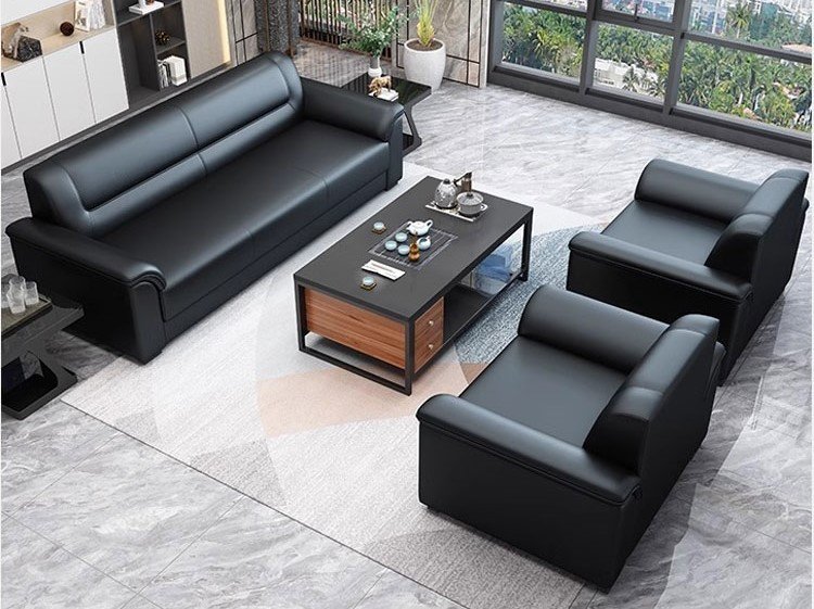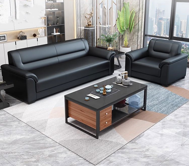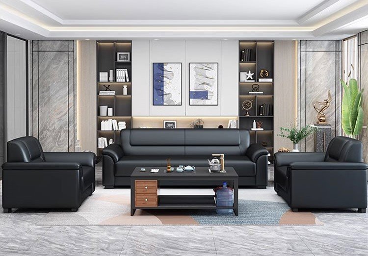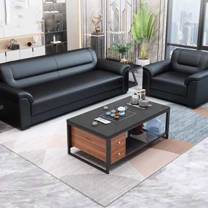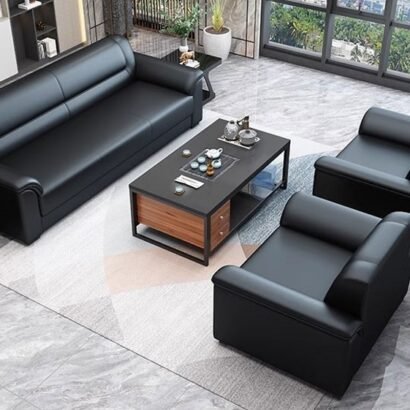 يعكس هذا الطقم المكتبي طابعًا إداريًا راقيًا يجمع بين الأناقة والعملية في تصميم متناسق يناسب مساحات الاستقبال والمكاتب التنفيذية. تتوزع الكنبة الرئيسية مع المقعدين الجانبيين بشكل منظم حول الطاولة الوسطية، مما يوفر جلسة مريحة تساعد على استقبال الضيوف وإجراء اللقاءات السريعة في أجواء احترافية هادئة. كما تضيف الألوان الداكنة مع التفاصيل الخشبية في الطاولة لمسة متوازنة تمنح المكان هيبة واضحة وشكلًا أكثر ثباتًا وتنظيمًا. وتزيد الخلفية المرتبة والإضاءة الهادئة من اكتمال المشهد، ليظهر المكتب بصورة أنيقة تعبر عن الذوق المهني العصري