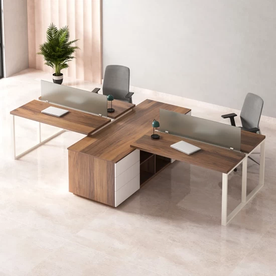 خلية عمل مصممة لبيئات الـOpen Space، بتجمع أربع أماكن في تكوين واحد يسهّل التواصل داخل الفريق مع الحفاظ على خصوصية خفيفة بفضل الفواصل الشفافة. كل مساحة عمل توفر سطح واسع للكمبيوتر والأوراق والأدوات اليومية، والتكوين المتقاطع يساعد على استغلال المساحة بكفاءة ويخلي الحركة حول المكاتب أسهل. وجود وحدة تخزين في المنتصف مفيد لحفظ المستندات أو الأدوات المشتركة ويقلل الزحمة على الأسطح. الألوان الخشبية مع القاعدة الفاتحة تعطي شكل هادي واحترافي يناسب المكاتب الحديثة