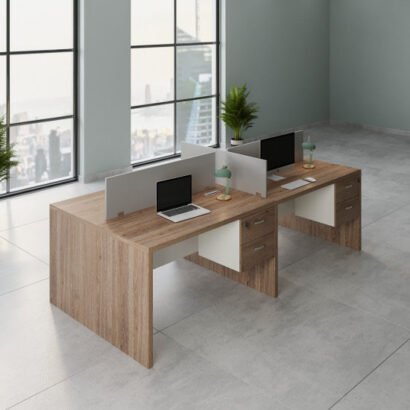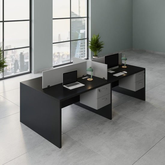 خلية عمل عملية بتصميم بسيط وقوي، بتوفر مكانين متقابلين مع فاصل وسطي يساعد على الخصوصية وتقليل التشتيت أثناء الشغل. السطح الداكن يعطي مظهر رسمي ومرتب، وبيكون مناسب للبيئات اللي بتحب الستايل المودرن الهادئ. وجود وحدة أدراج/تخزين بين المكانين يساعد على حفظ الأدوات والملفات الأساسية قريب وسهل الوصول، وده يقلل الفوضى فوق السطح ويحافظ على ترتيب مكان العمل. التصميم المفتوح من تحت يسهّل حركة الكراسي والتنظيف، وبيخلي الخلية مناسبة للمكاتب المفتوحة أو المساحات الصغيرة اللي تحتاج تنظيم ثابت بدون زحمة