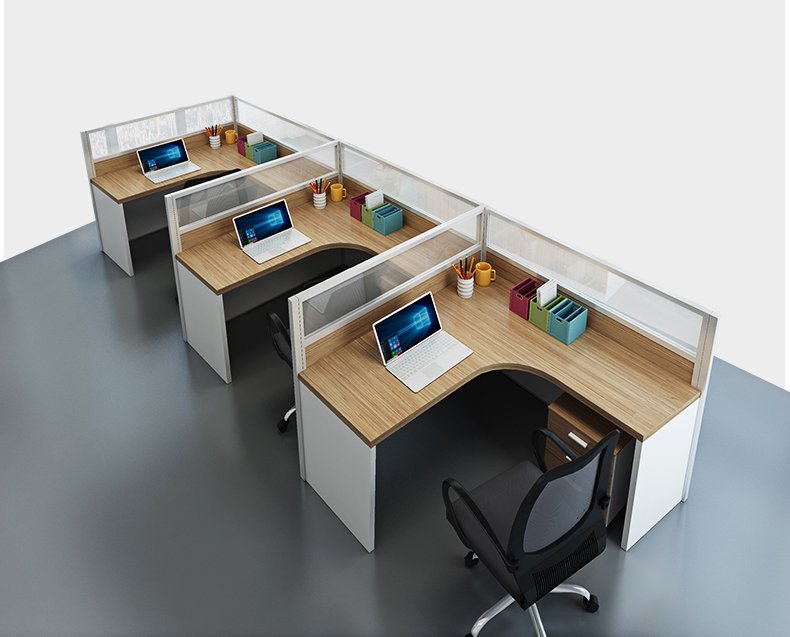 خلية عمل عملية مصممة لتجميع أكثر من موظف في نفس الوحدة مع الحفاظ على مساحة شخصية لكل شخص. الفواصل المرتفعة تقلّل التشتيت وتدي إحساس بالتركيز، وفي نفس الوقت تخلّي شكل المكان مرتب واحترافي. سطح العمل الخشبي واسع يكفي للكمبيوتر والملفات والأدوات اليومية، ومع التصميم المفتوح تحت الطاولة تبقى حركة الكرسي مريحة. مناسبة جدًا لفرق العمل في الشركات أو مراكز الخدمة اللي بتحتاج تنظيم ثابت واستغلال ذكي للمساحة بدون زحمة